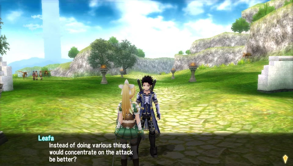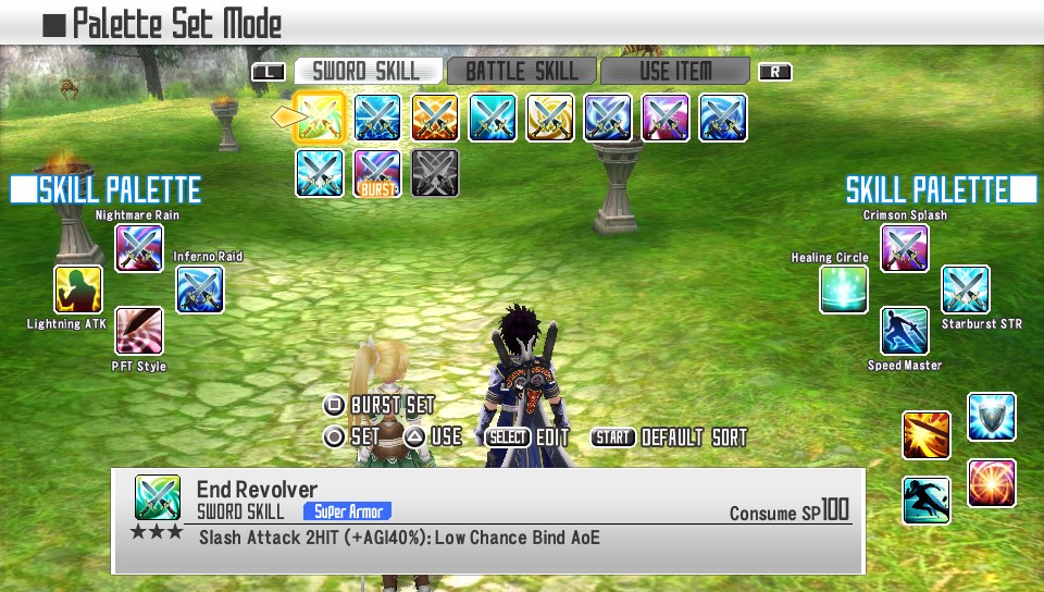The gameplay for both portions are deceptively simple.  You're given three sets of skill palettes: the four face buttons naturally, and a set tied to the four face buttons  for both the left and the right trigger, bringing the total of quickly usable skills to 12.  Further, the left and right triggers also allow you to issue orders to your party member through the D-Pad.  The default Circle button is tied to your 'Burst Attack', which is basically a sword combo which culminates in a changeable Sword Skill.  While it is possible to get through most, if not all, of the game using just this attack, it is far more satisfying to vary your attacks according to the opponent.  As such, the game is at once an Action RPG and a Tactical RPG.  In many fights, I find myself switching - Down on the D-Pad during combat, and an ability that basically transfers all aggro from you to your partner - frequently with my party member, moving from attack to support with ease.  This allows you to heal up between major boss attacks - or even allow your partner to take the damage which may kill you. One has to be mindful however, since if either you or your partner dies, it's game over and you have to start from the last autosave, which is far more annoying that you might think.  Still, I've found the AI partner much hardier than myself at times, so it comes down to knowledge of your opponent and your skill at issuing orders during combat.