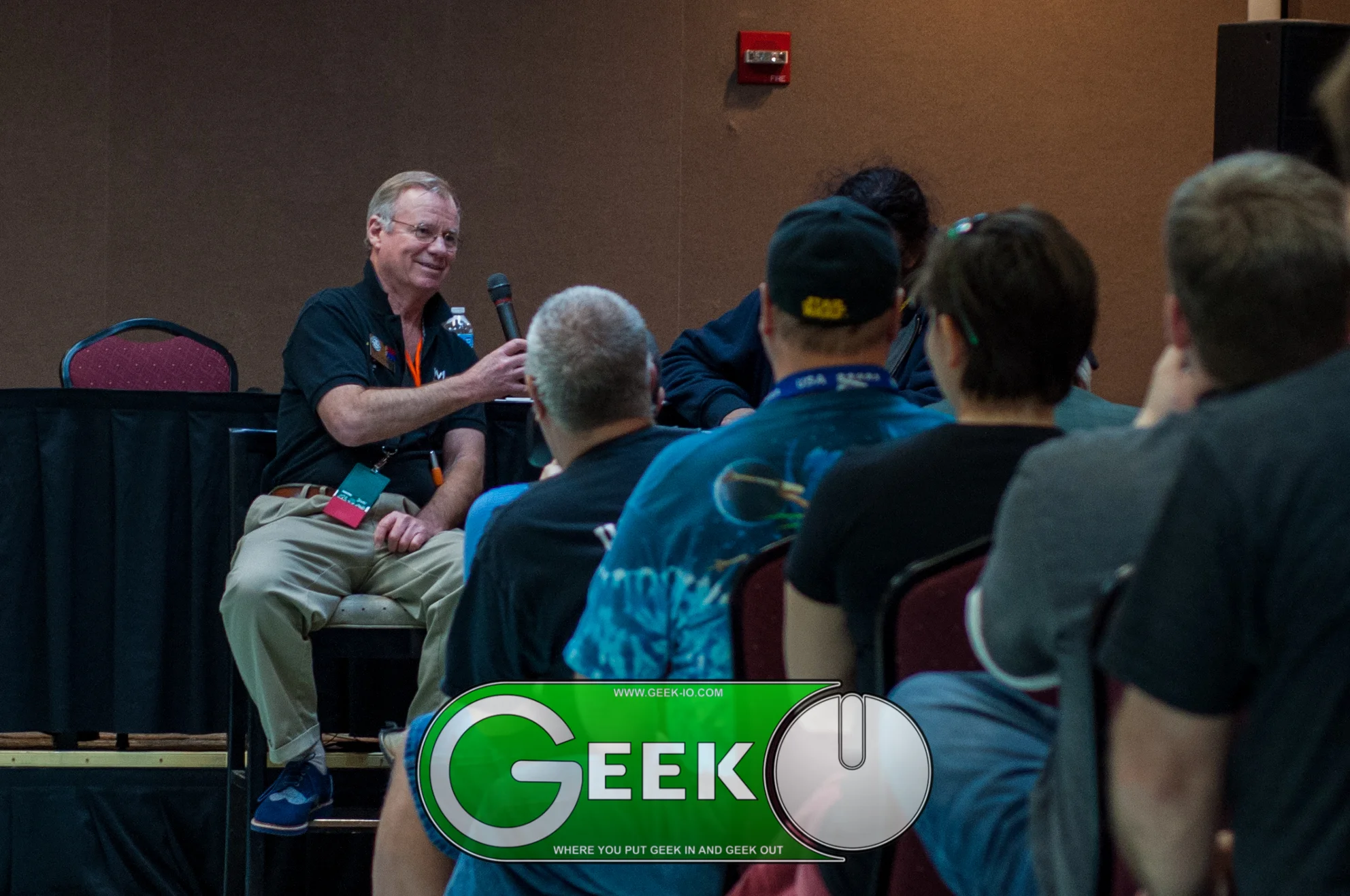 We entered the ballroom, which was arranged as you might expect--a small stage, some microphones, some speakers, and occasionally a few stools or chairs for the guests. The audience was seated in rows in a semi-circle around the stage.
